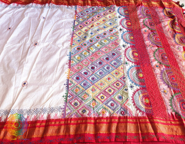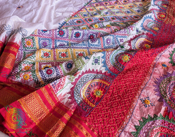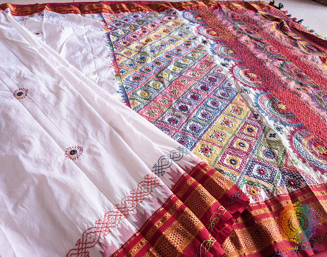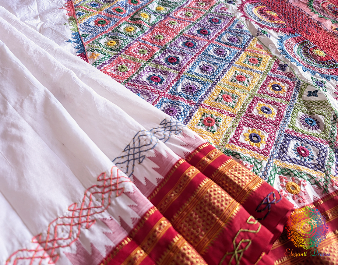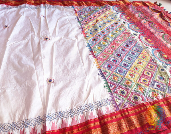 Here we bring a gorgeous White Lambani Handwork Pure Ilkal Silk Saree. The palla and border are adorned with beautiful Lambani embroidery with colourful threads and mirrors. This Saree comes with embroidered blouse piece.