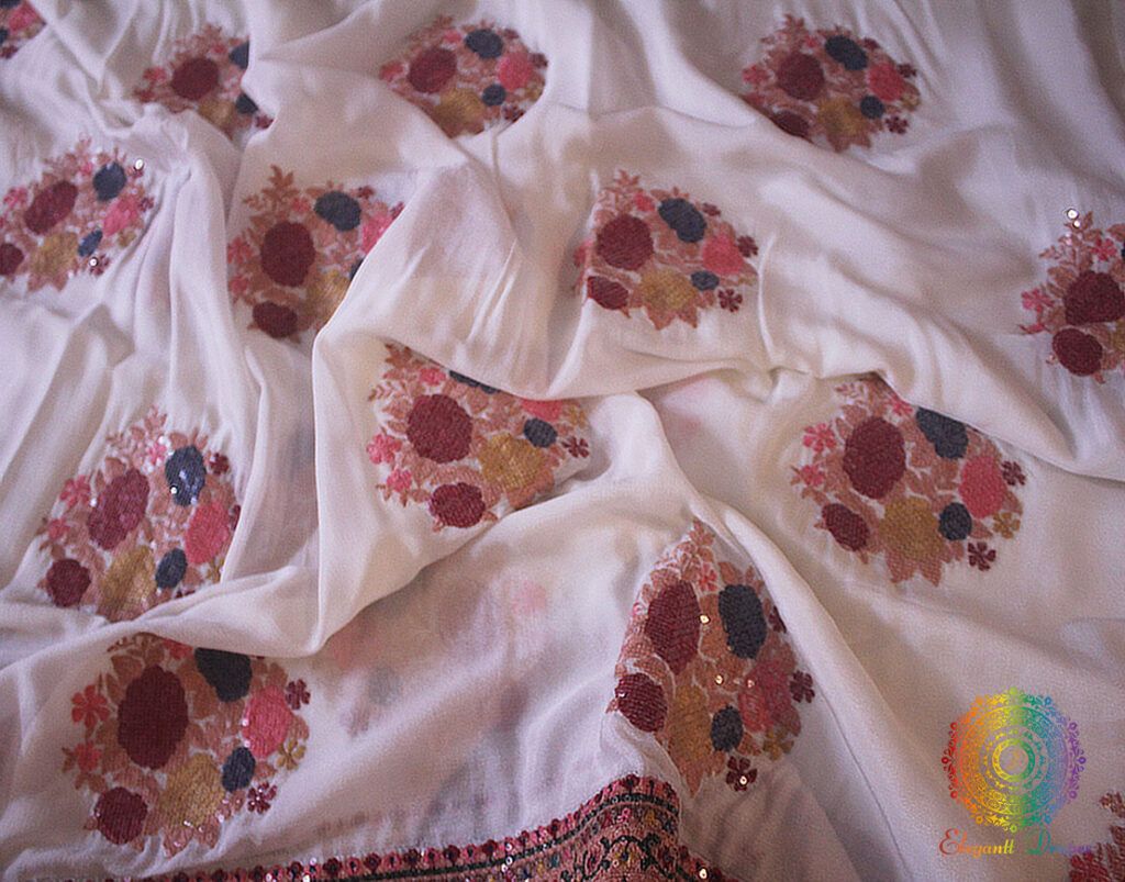 Simply glamorous White Pure Chinon Crepe Sequins Work Saree. It has beautiful work on the border and small bootas all over. Furthermore, the pallu is adorned with fabulous tassels. Comes with a contrasting blouse piece. Not to mention this is a saree not to be missed.